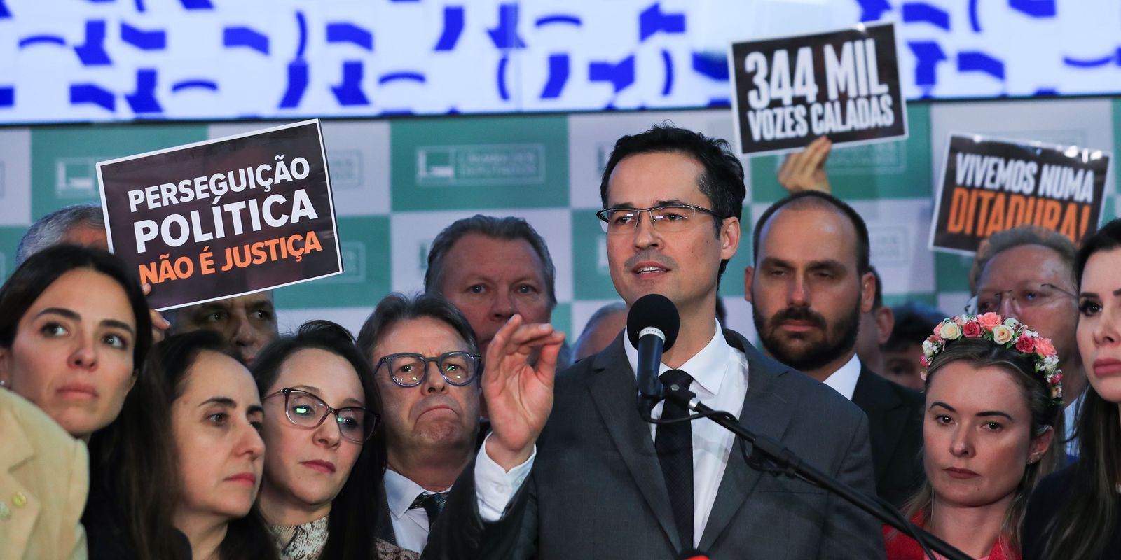 Acompanhado de deputados de oposição ao governo, como Eduardo Bolsonaro (PL-SP), Bia Kicis (PL-DF), Carolina De Toni (PL-SC), Dallagnol atacou adversários políticos, como os do PT – legenda que apresentação ação contra eleição do deputado e que resultou na cassação, ministros do TSE e também parlamentares investigados por ele durante a Operação Lava Jato, como o presidente Luiz Inácio Lula da Silva.